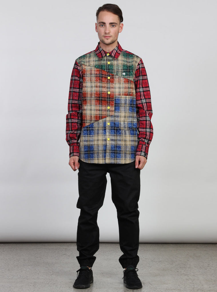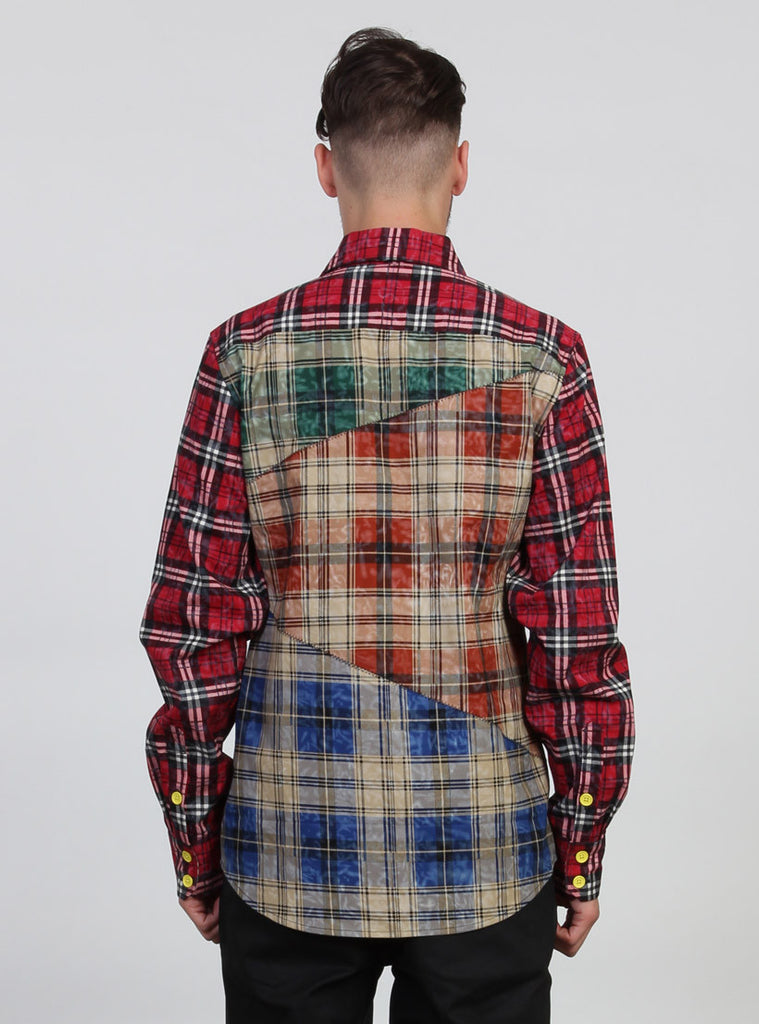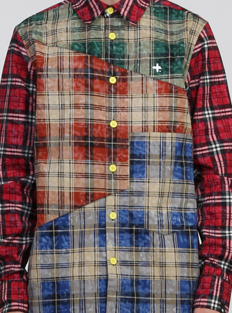 Long sleeve collared button up shirt with contrasting angled check panels. +. Chest print and contrasting buttons.