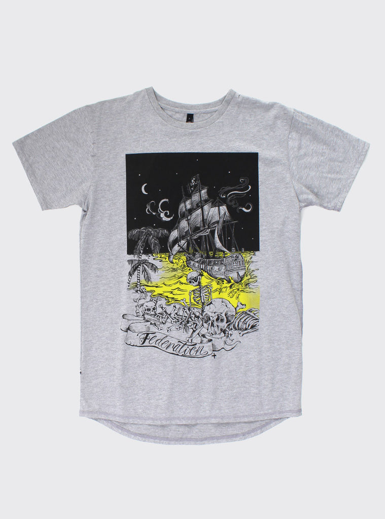 Shortsleeve long length tee, slim fit with subtle drop tail. Contrasting exposed stitching on left side seam and bartacking on right shoulder. Featuring federation custom print on front and +. Pip in left side seam.