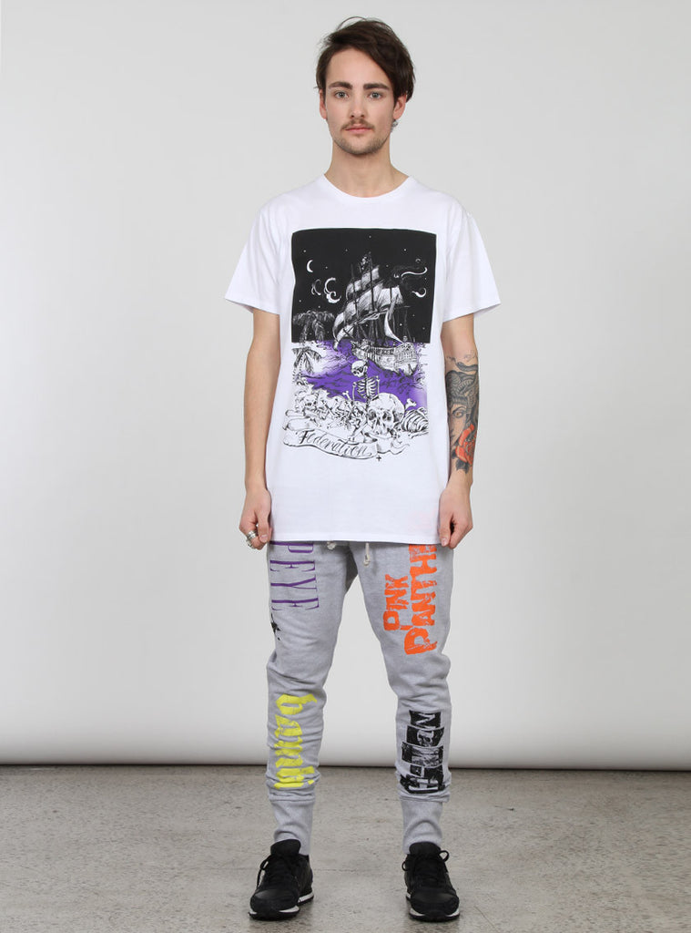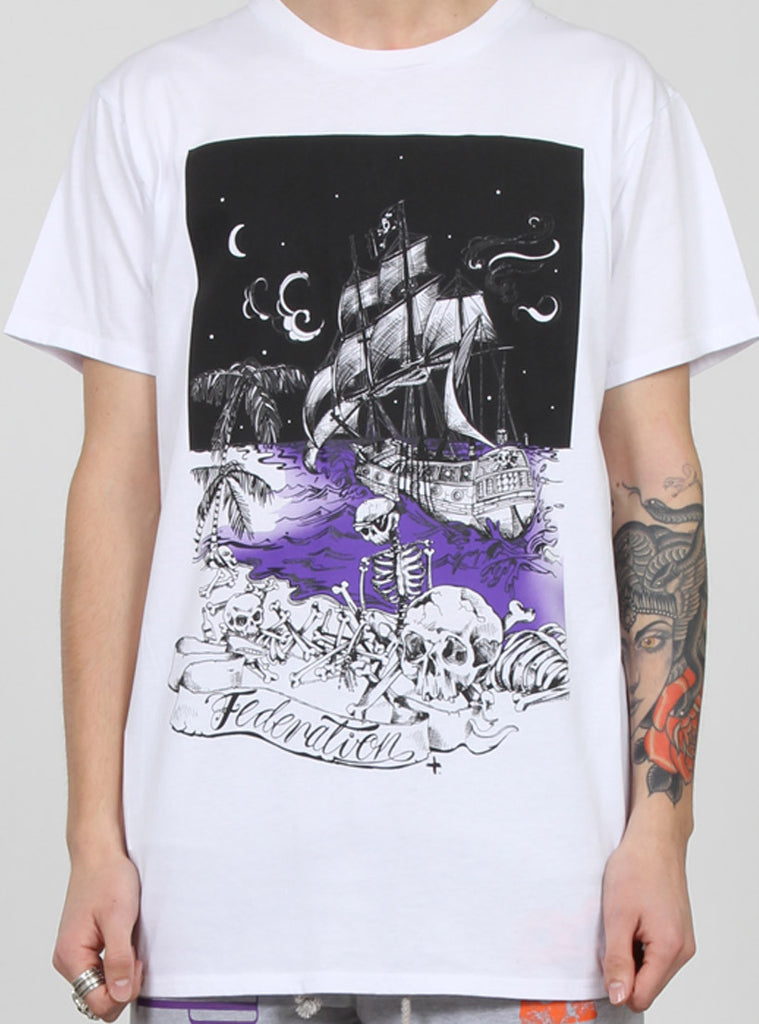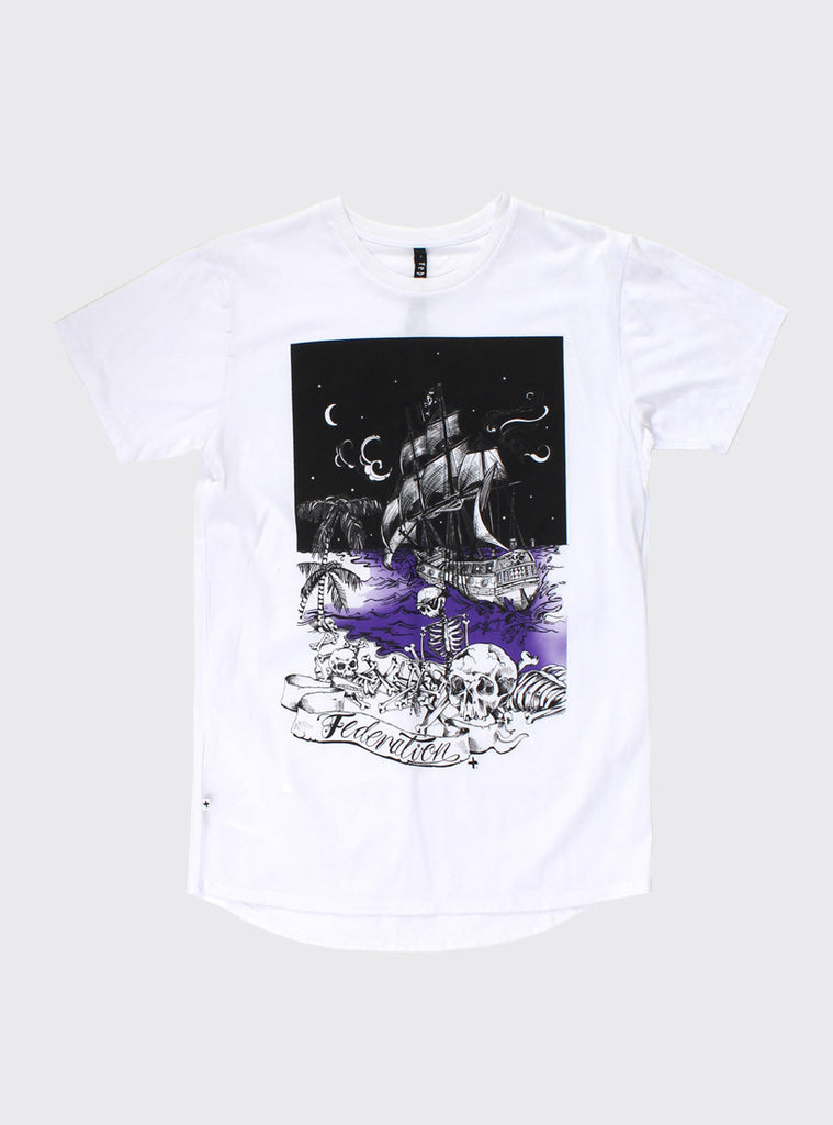 Shortsleeve long length tee, slim fit with subtle drop tail. Contrasting exposed stitching on left side seam and bartacking on right shoulder. Featuring federation custom print on front and +. Pip in left side seam.