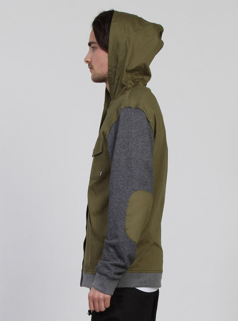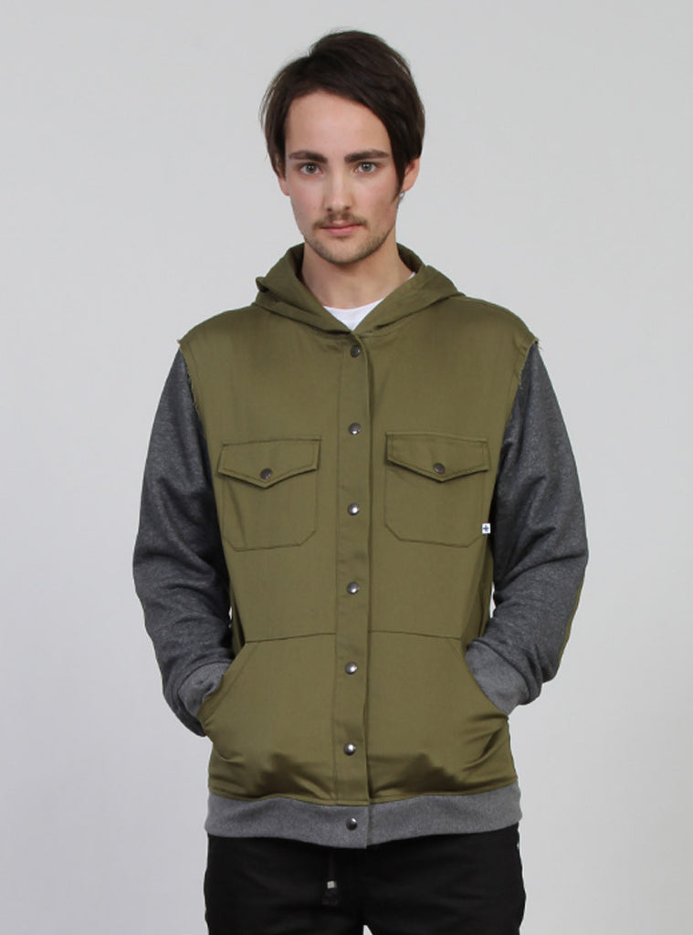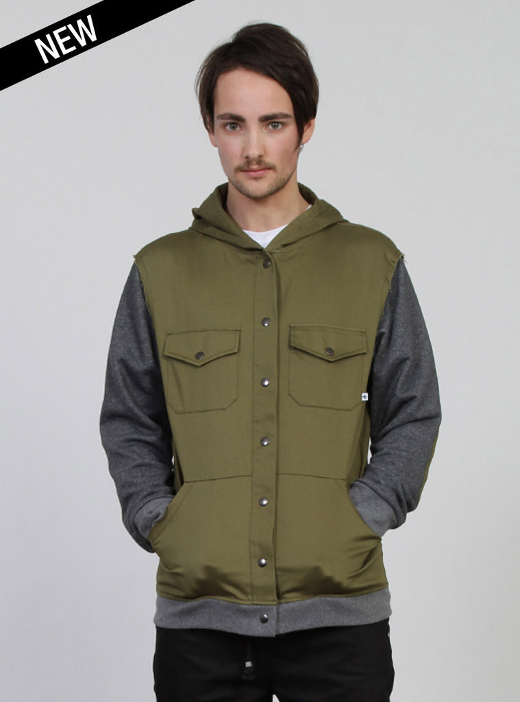 Mens varsity style molten wool jacket with a biker twist. Contrasting leather like panels and contrast striped rib neck, hem and cuffs. +. Print on left chest and Federation print on back.