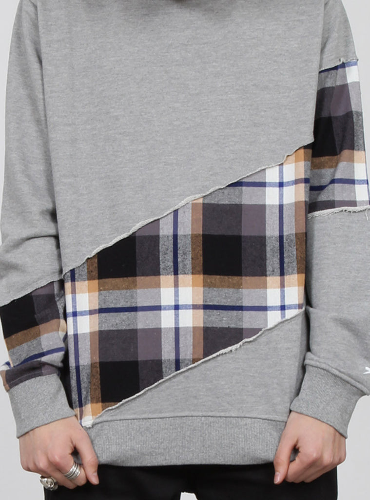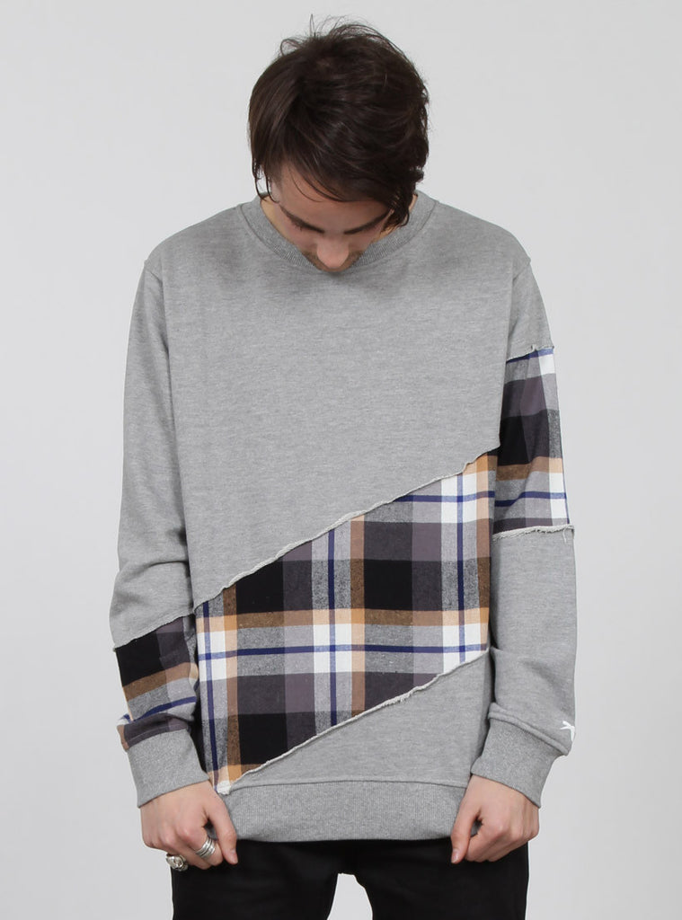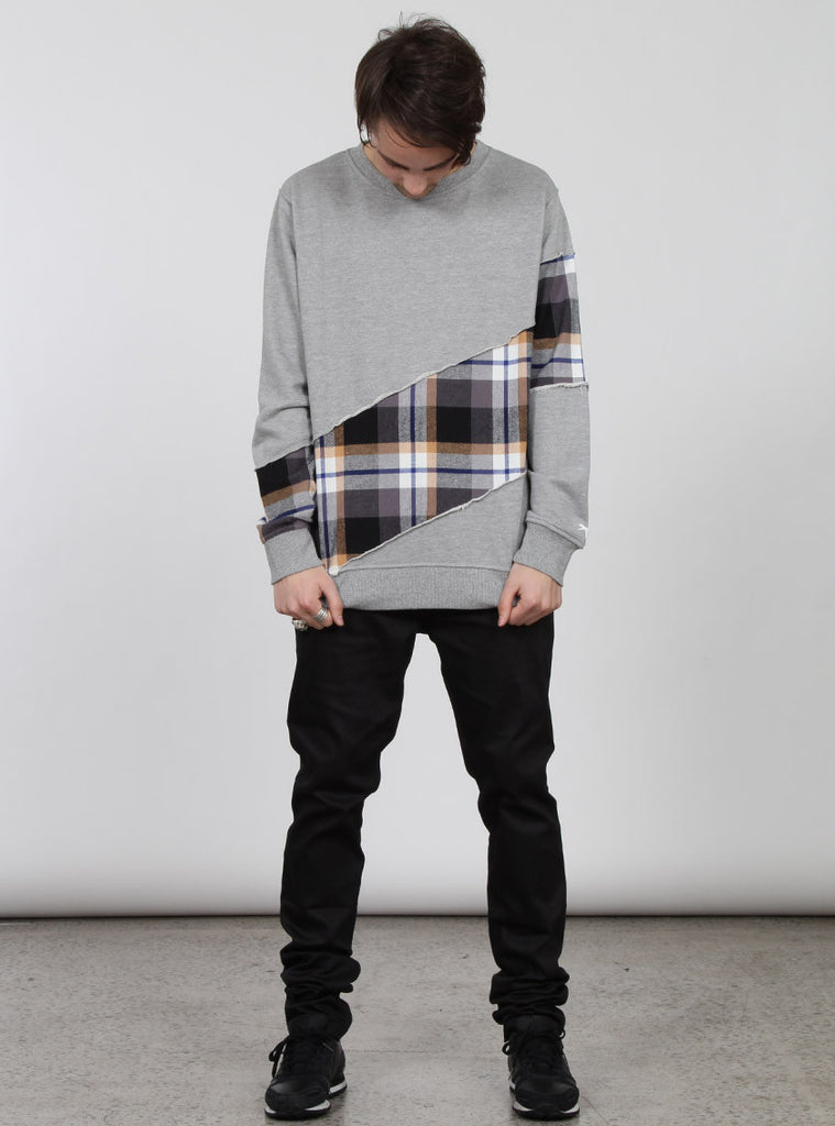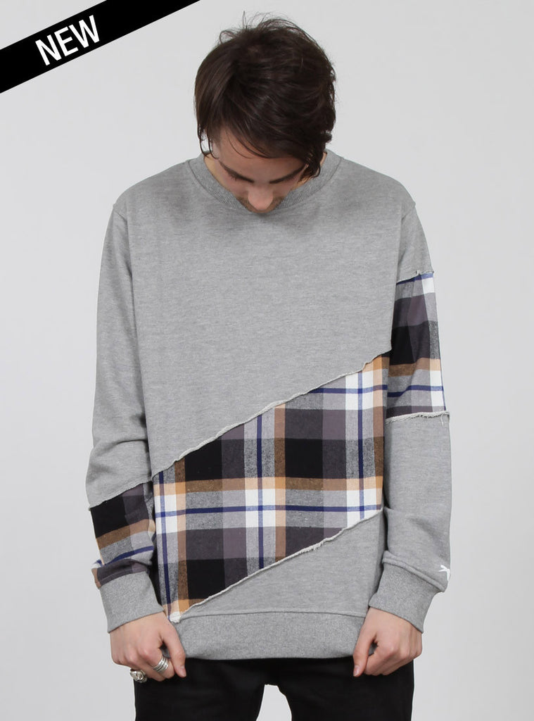 Mens relaxed fit crew featuring contrasting angled check panel inserted through front and back and sleeves +. Print on left hem.