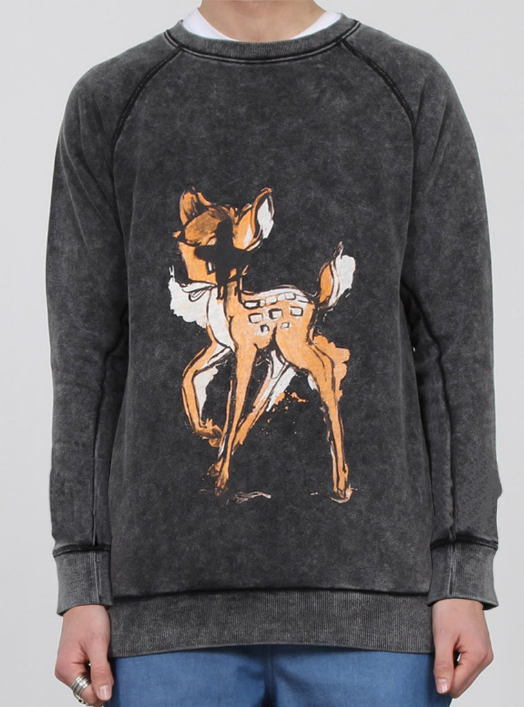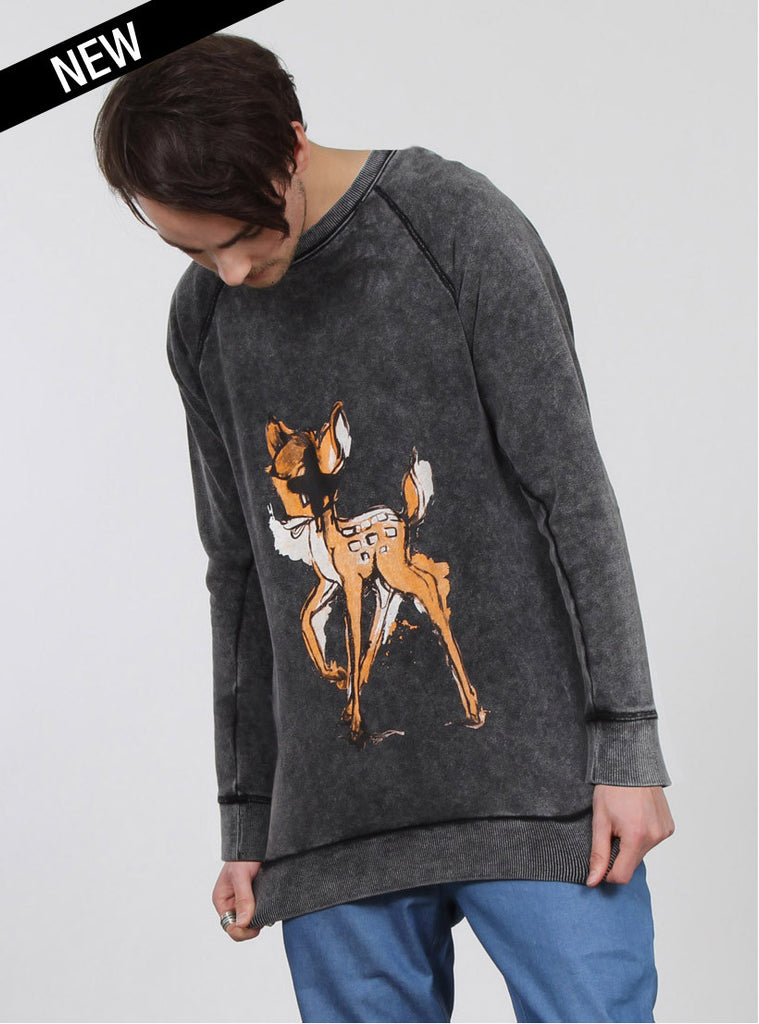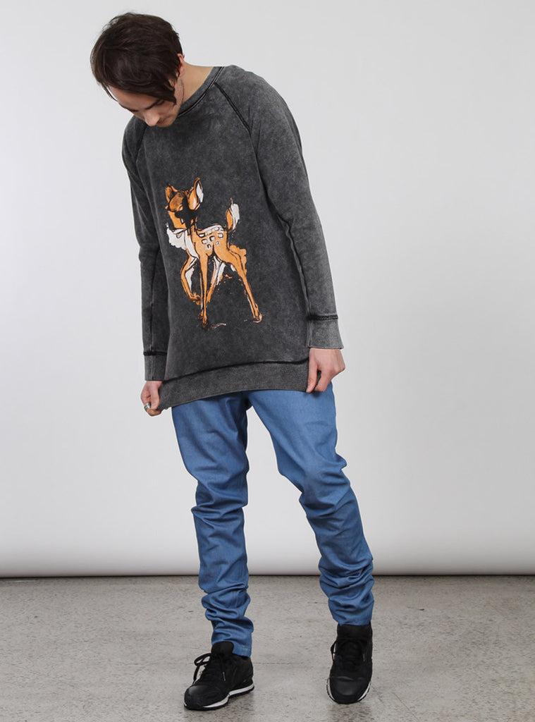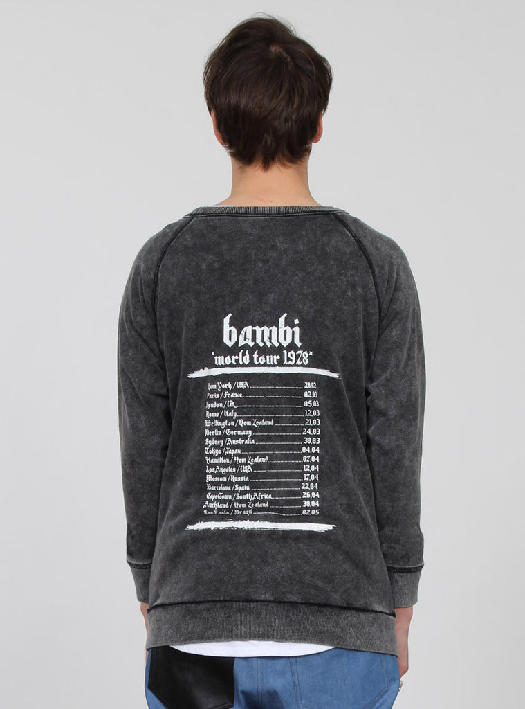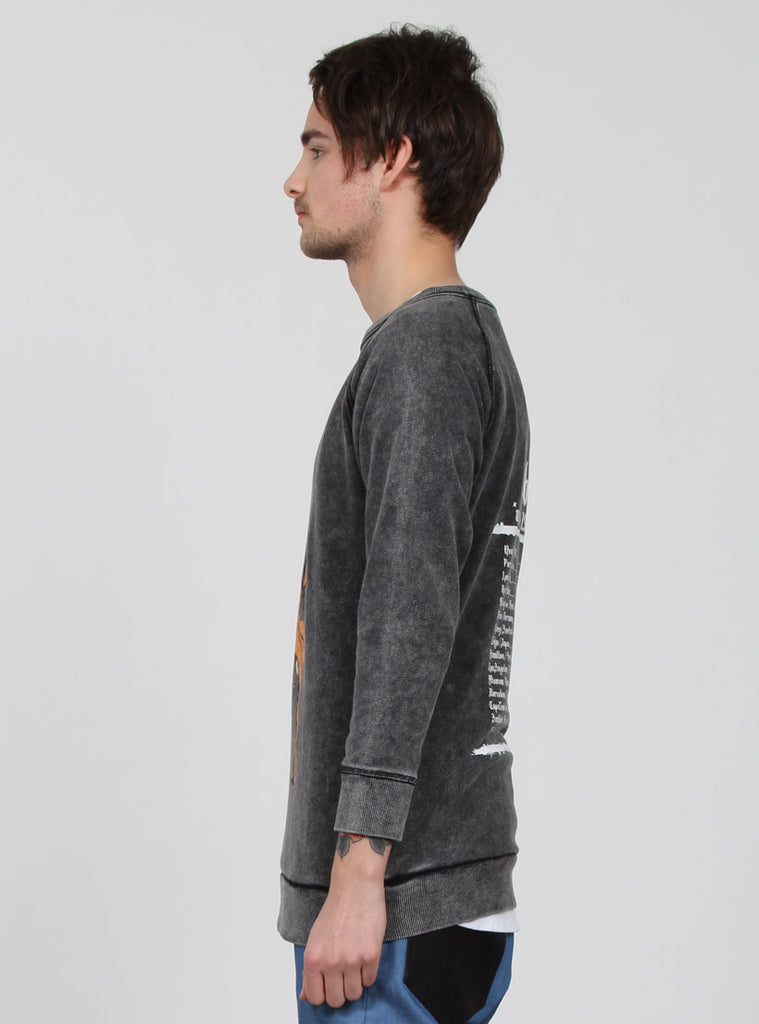 Men’s relaxed fit crew, rib hem cuff and neck. Featuring custom federation print on front and back and distressing detailing. +. Pip in left side seam.