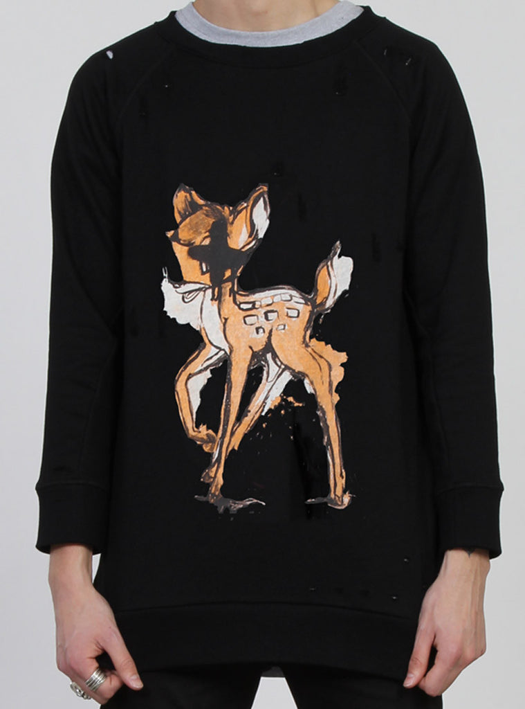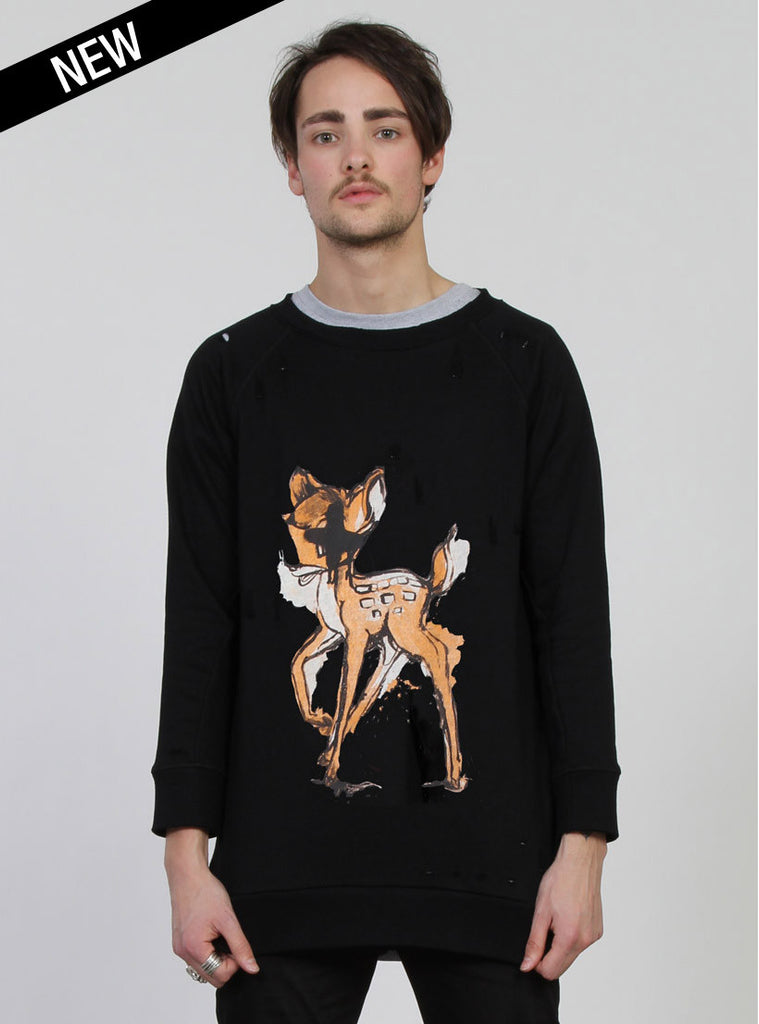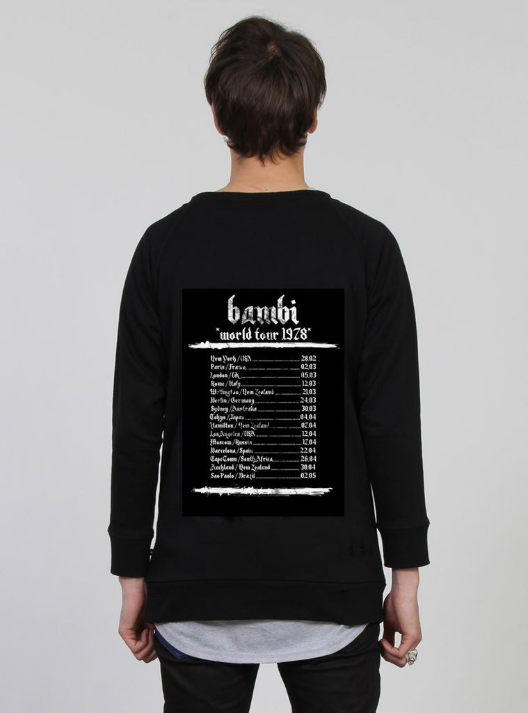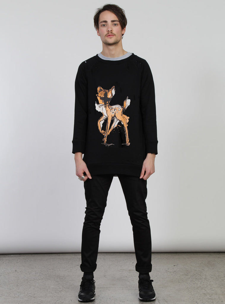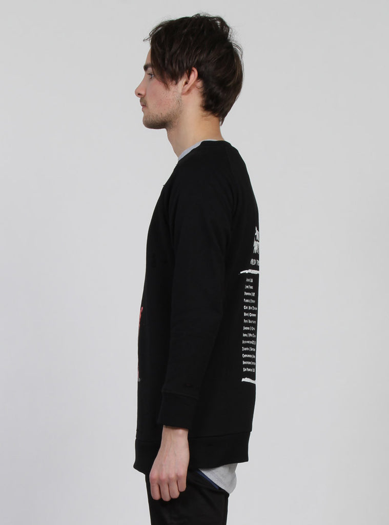Men’s relaxed fit crew, rib hem cuff and neck. Featuring custom federation print on front and back and distressing detailing. +. Pip in left side seam.