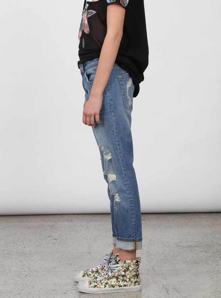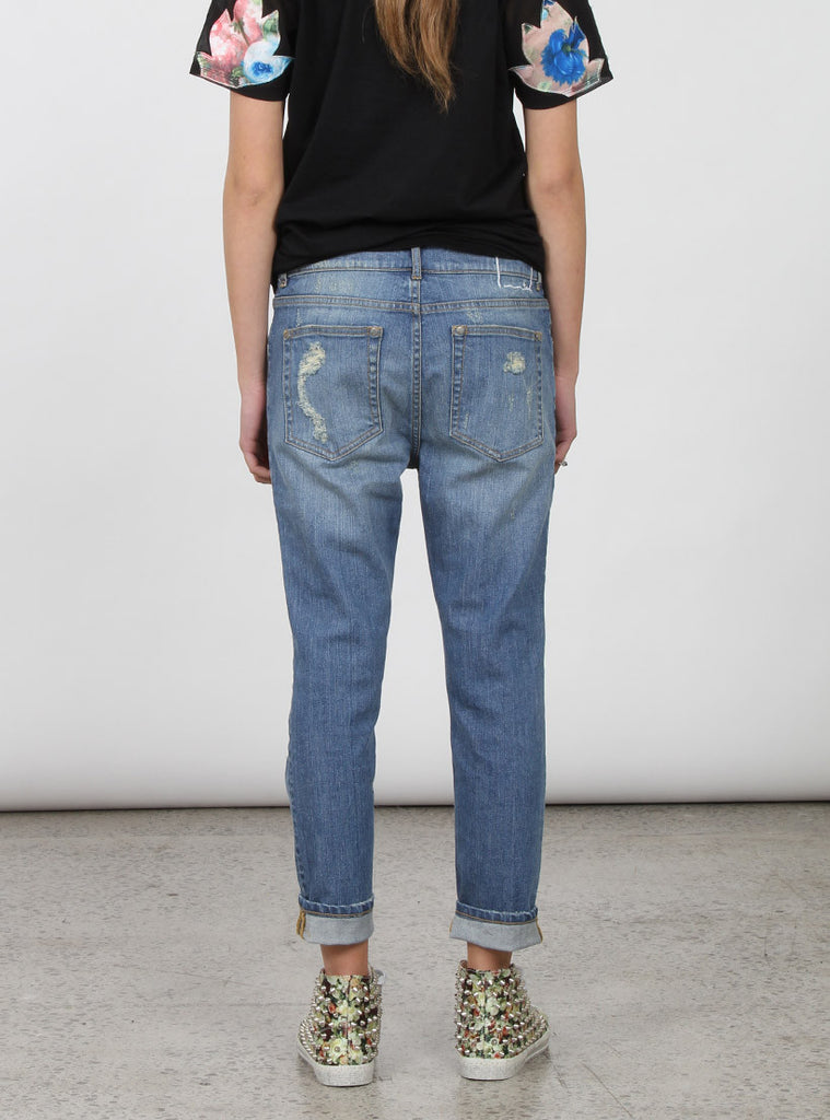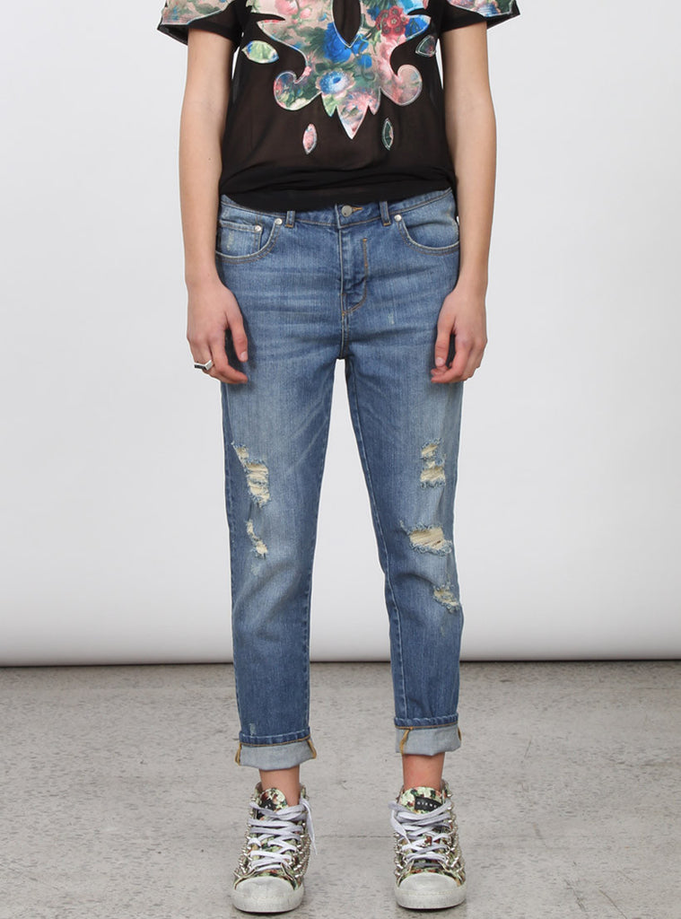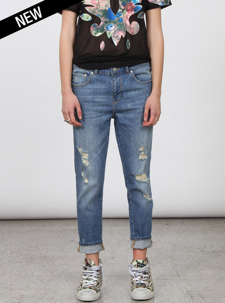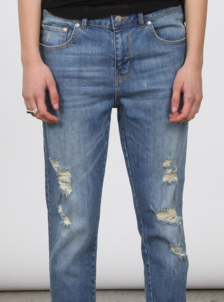 Relaxed jeans with featuring disstressing and topstitching design detailing. Federation branded waistband embroidery, +. Pip, tack button and rivets