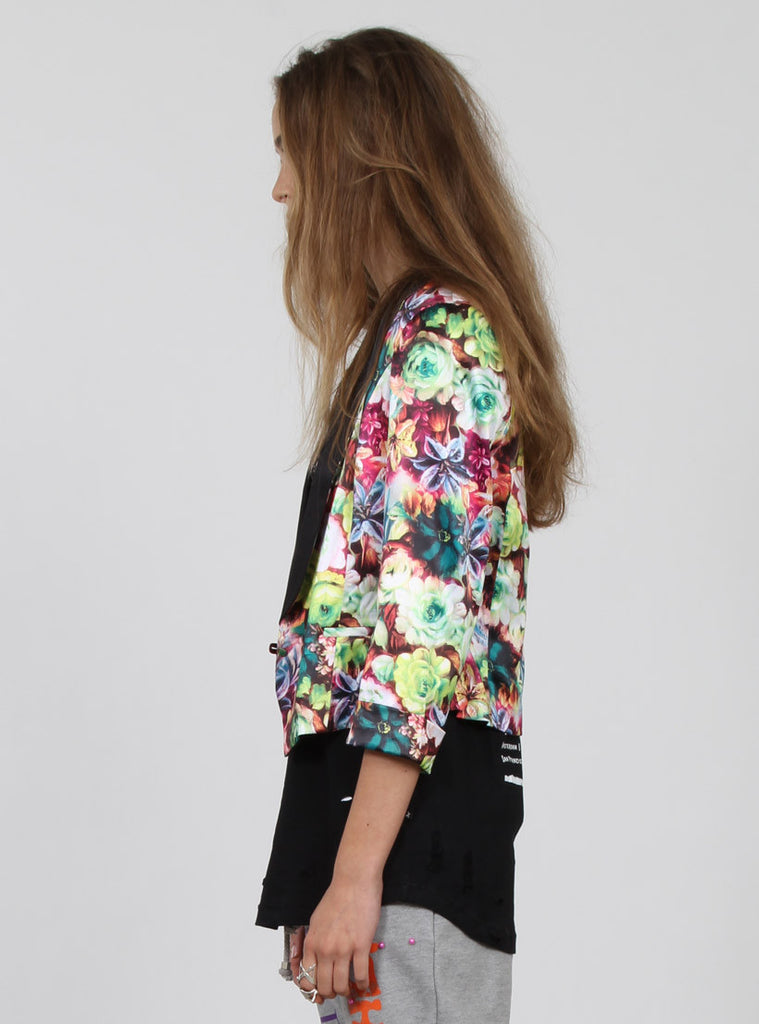 Fitted cropped blazer with princess line panel detailing and 2 piece cropped sleeves. Featuring contrast lapel, two jetted pockets, centre front self covered button and loop. +. Pip in left side seam.