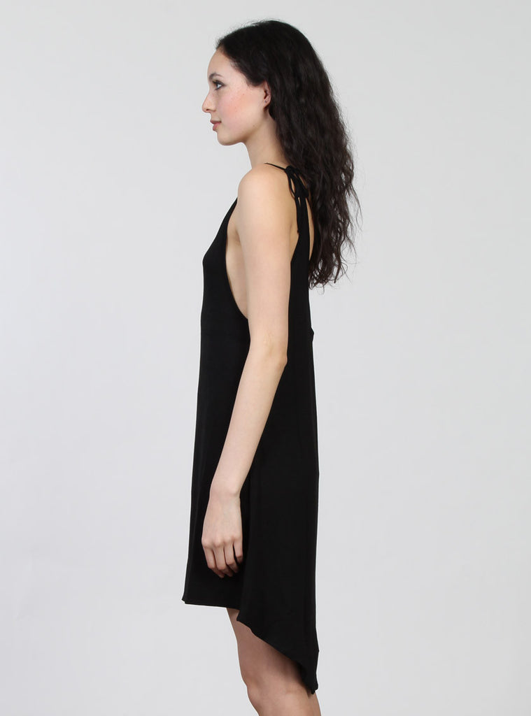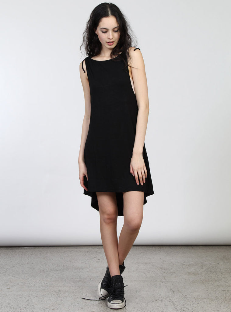 tie up shoulder mid length dress, with high low hem. low cut armholes and back in soft jersey. +. pip in left side seam