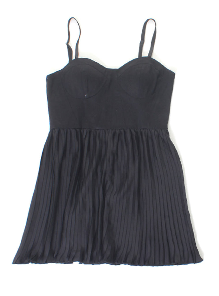 mid thigh length dress, pleated skirt with fitted paneled bodice. stretch denim panelled bodice featuring padded cups and adjustable elastic straps. centre back invisible zip and +. pip in left side seam.