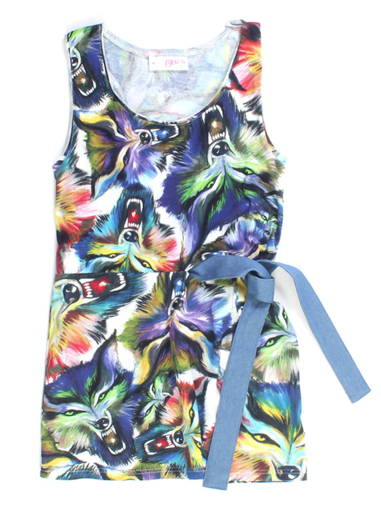 racer back, mid thigh length t-shirt dress. stitched in tuck along right waistline to creat tunnel with contrasting denim waist tie threaded through. Raw edged binding detailing on neckline and armhole, +. pip in left side seam.