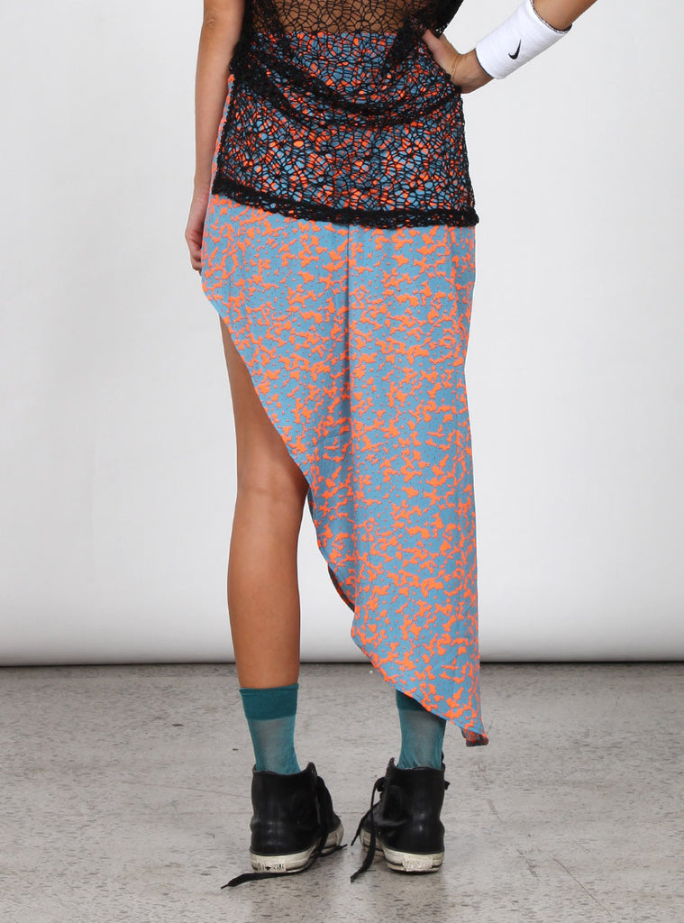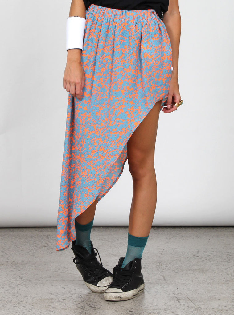 elastic waistband gathered skirt, mid thigh lenght on left with slanted hem line sweeping to full legth on right side, +. Pip in left side seam