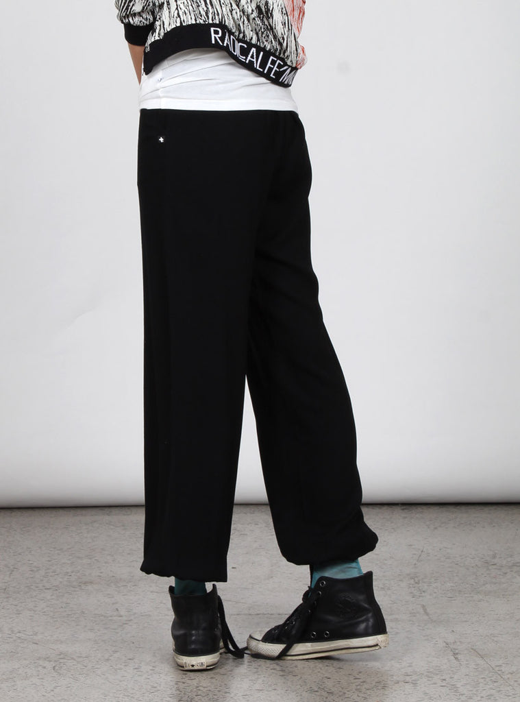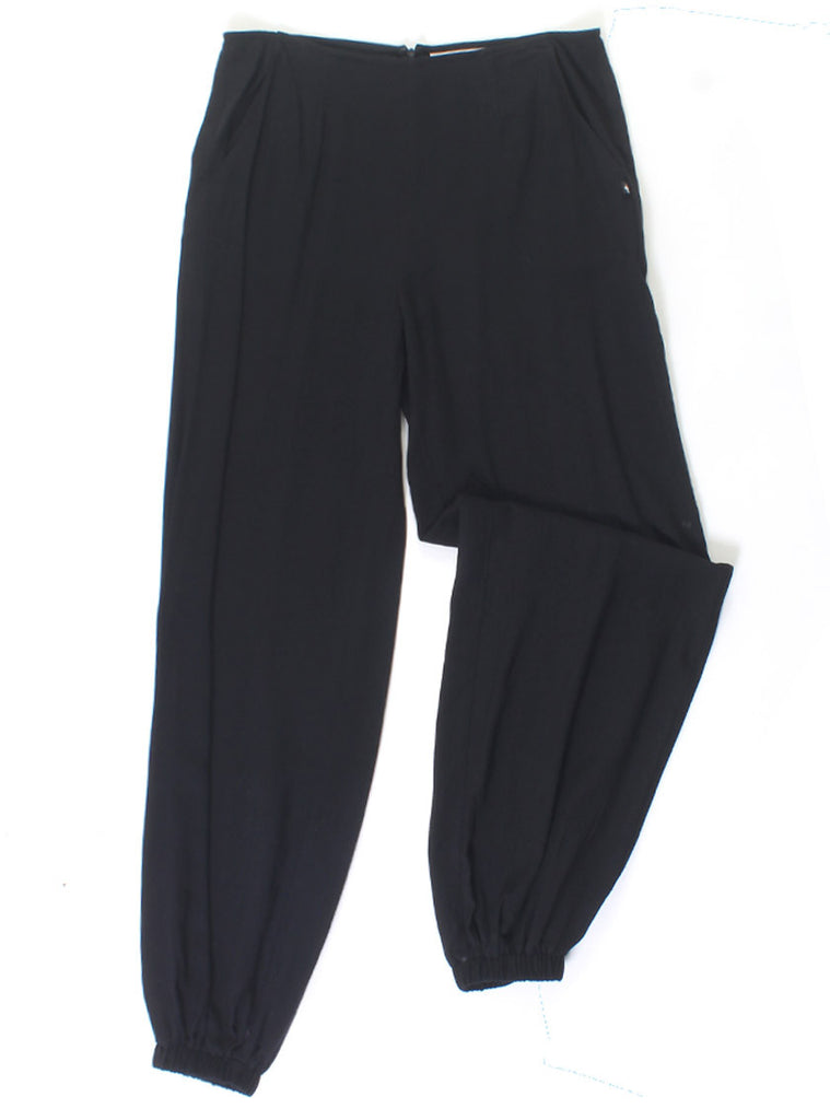 wide leg womens pants with elastic cuff, fitted through waist with side angled pockets and +. Pip in left side seam