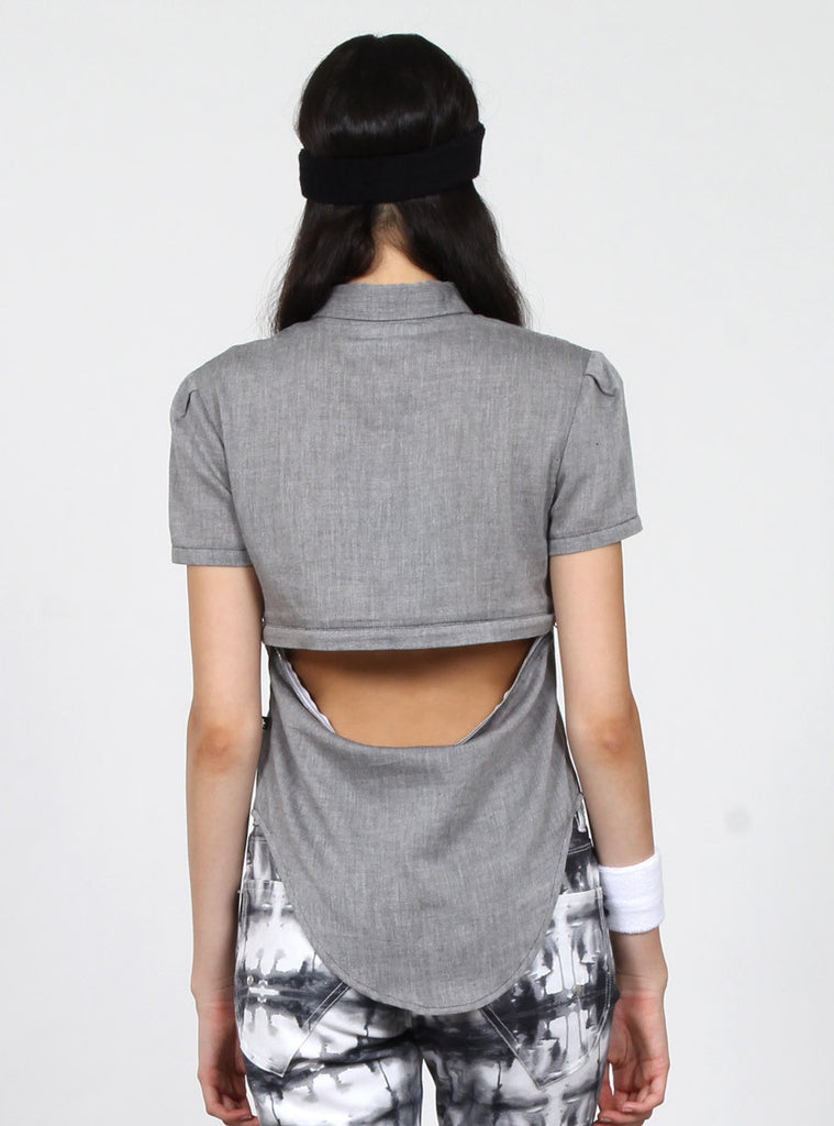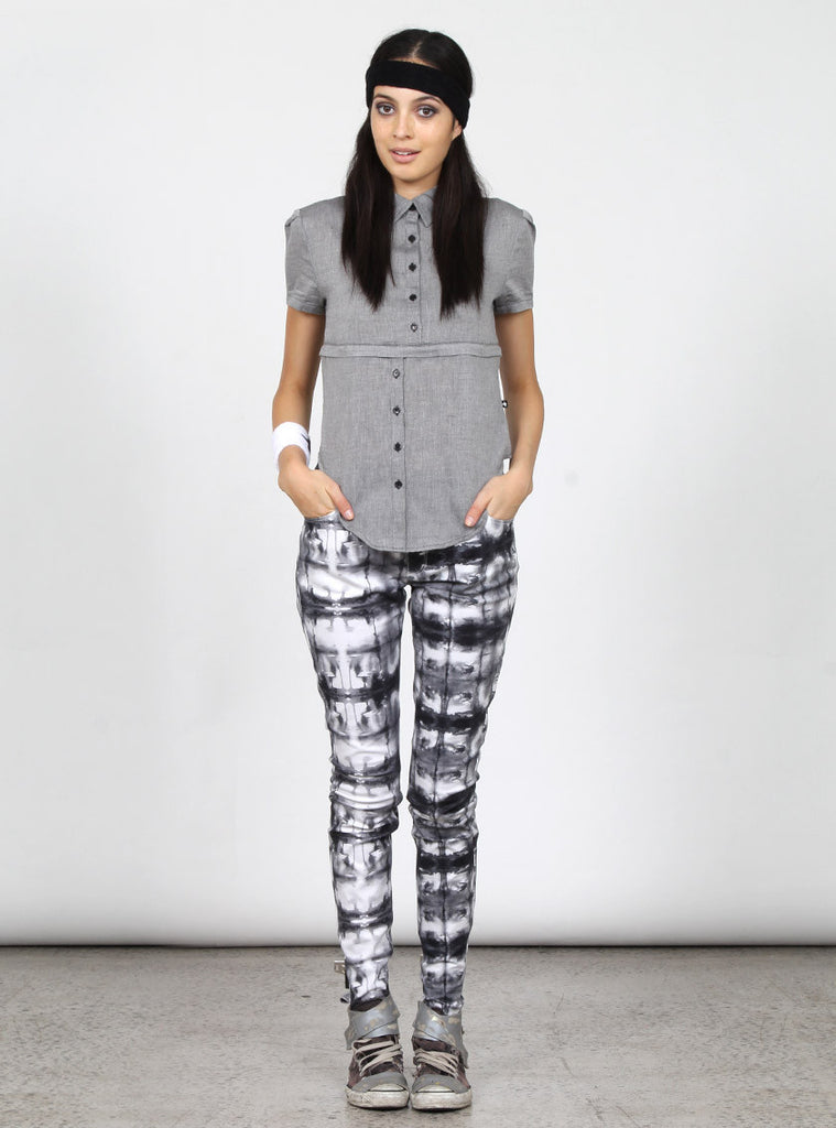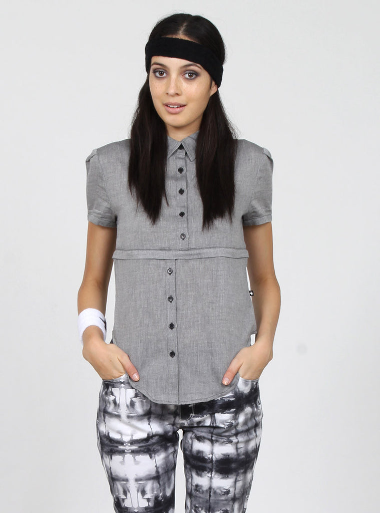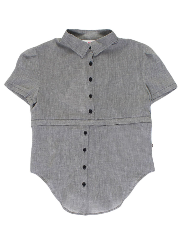 fitted short sleeve button up collared shirt, with zip off waist detailing and off set front placket. Shirt tail hem and +. Pip in left side seam.