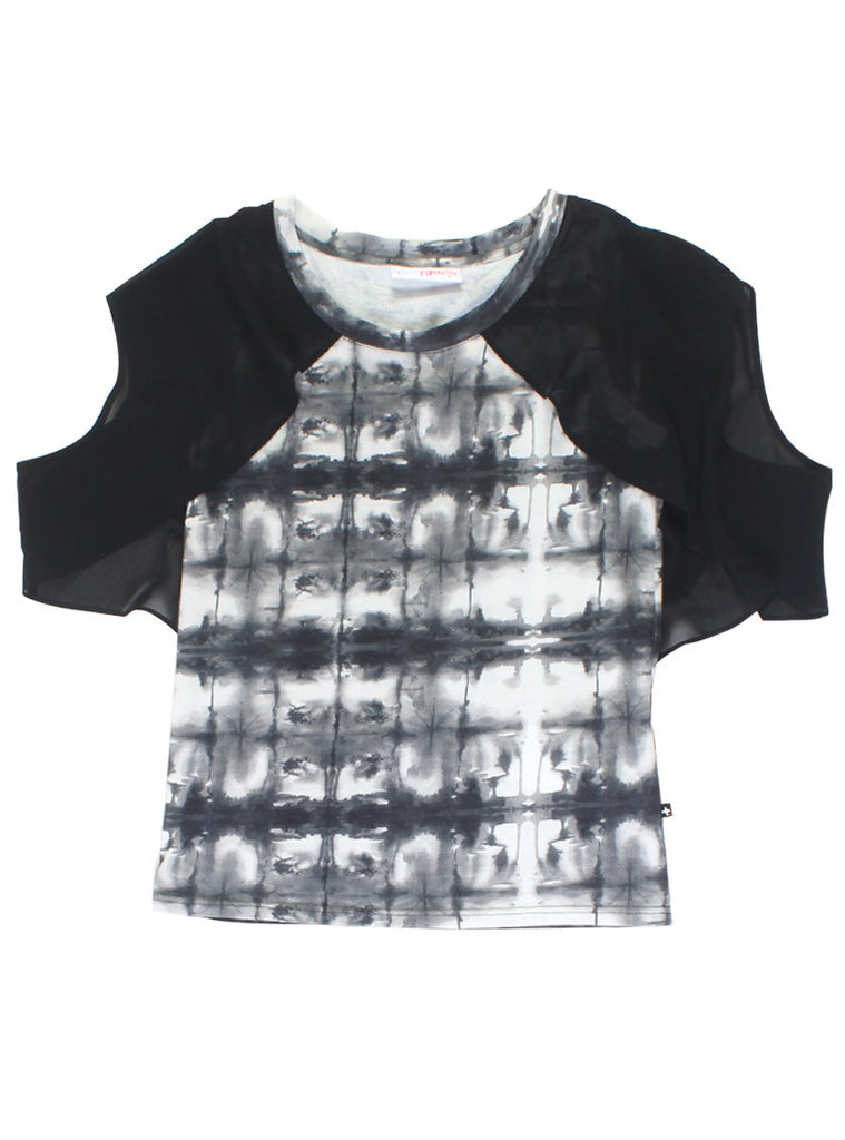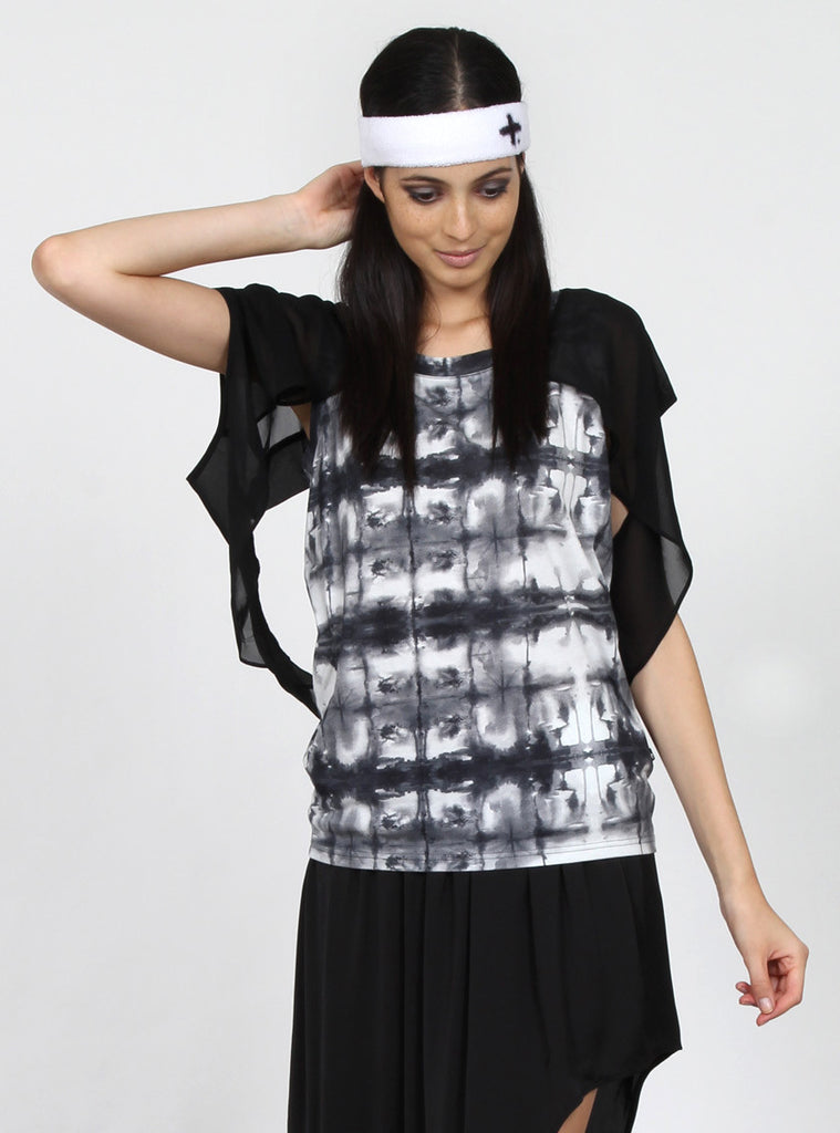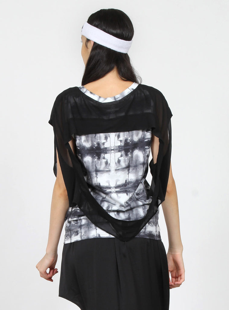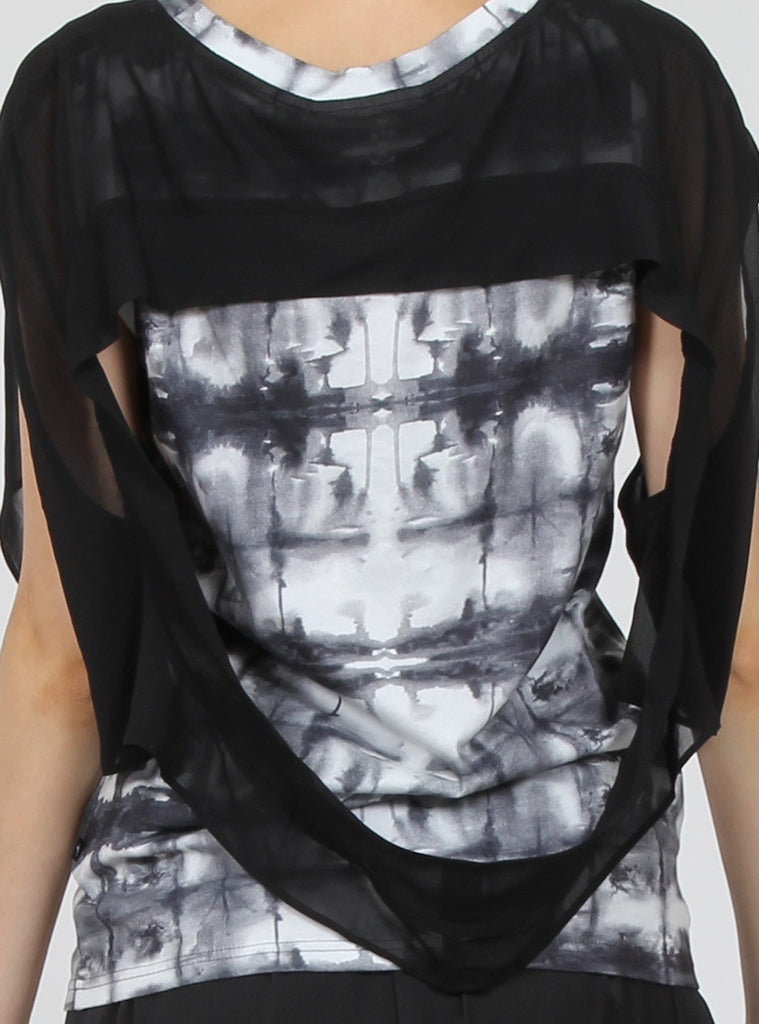 fitted sleeveless t-shirt in federation custom print jersey, with contrasting chiffon cap sleeve draped back overlay, +. Pip in left side seam