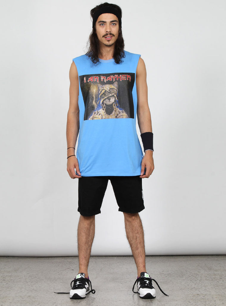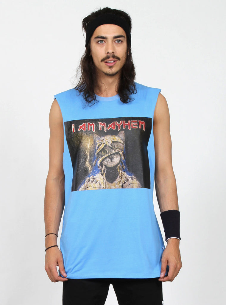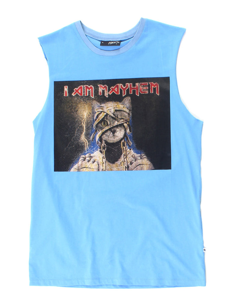 relaxed fit sleeveless tank with raw hemmed armholes, featuring federation "i am mayhem" print on centre front and +. pip in left side seam