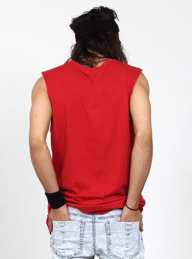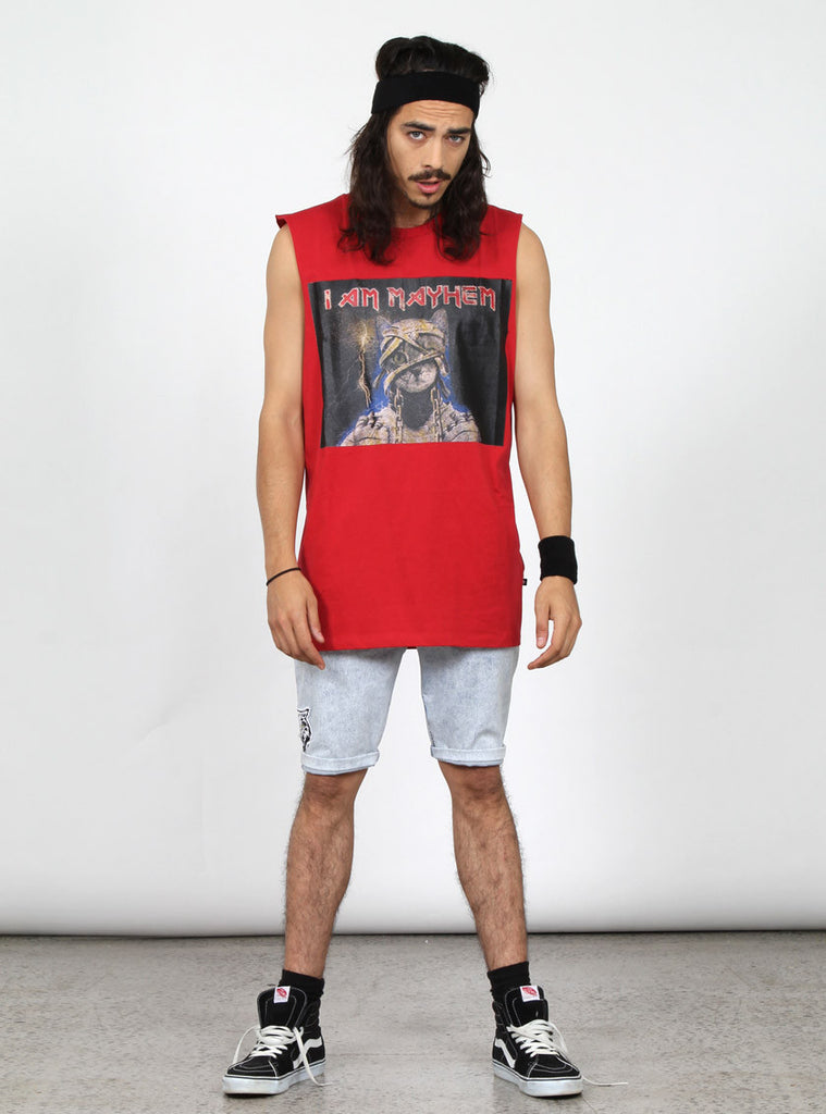 relaxed fit sleeveless tank with raw hemmed armholes, featuring federation "i am mayhem" print on centre front and +. pip in left side seam
