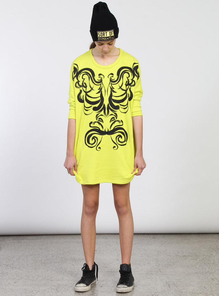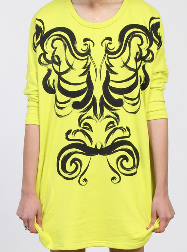 Relaxed fit sweatshirt dress with slim cropped sleeves, curved front and back hem with side splits and pockets. Featuring renaissance inspired skeletal shaped brush stroke print on front and back. +. Pip in left side seam.