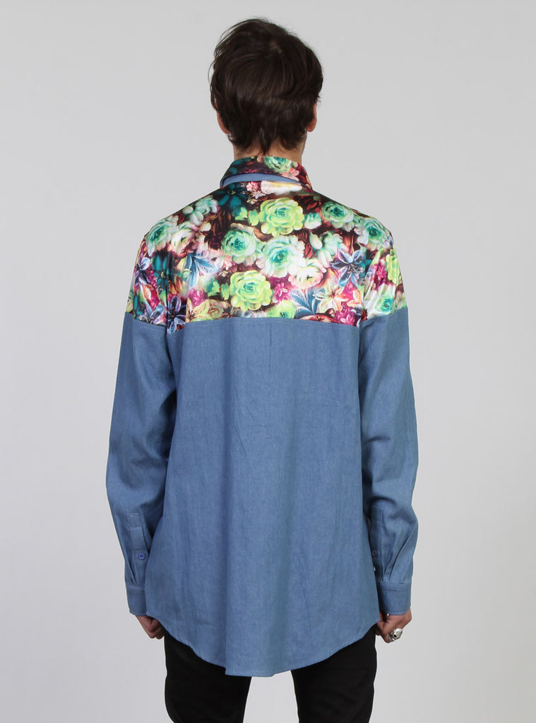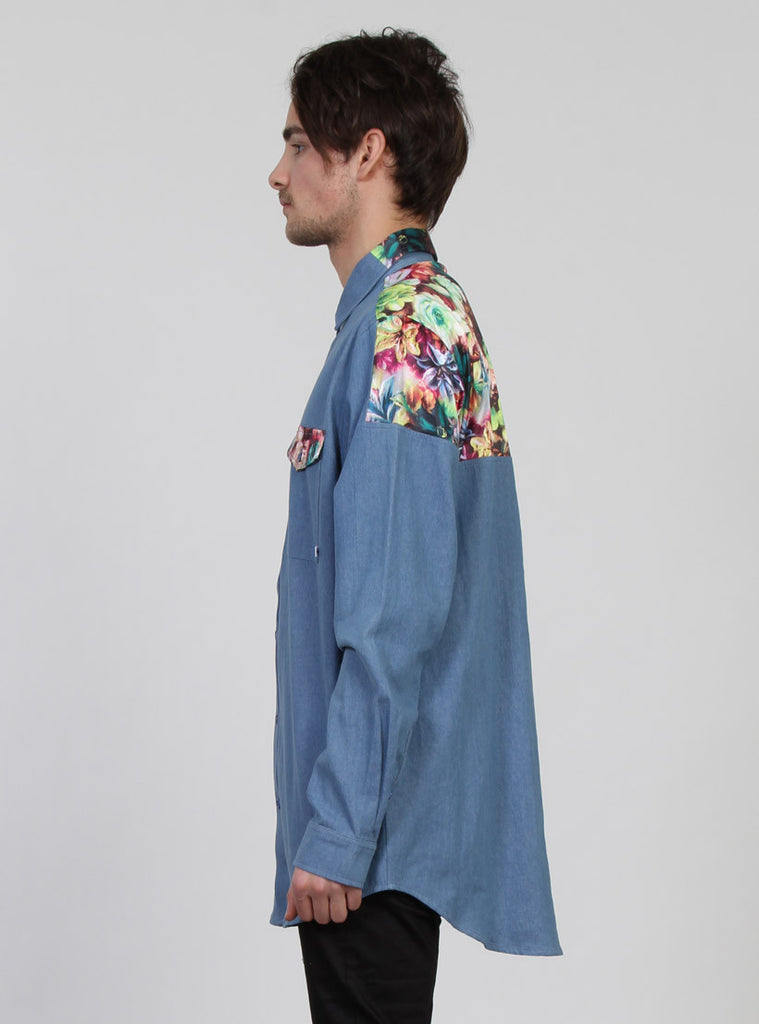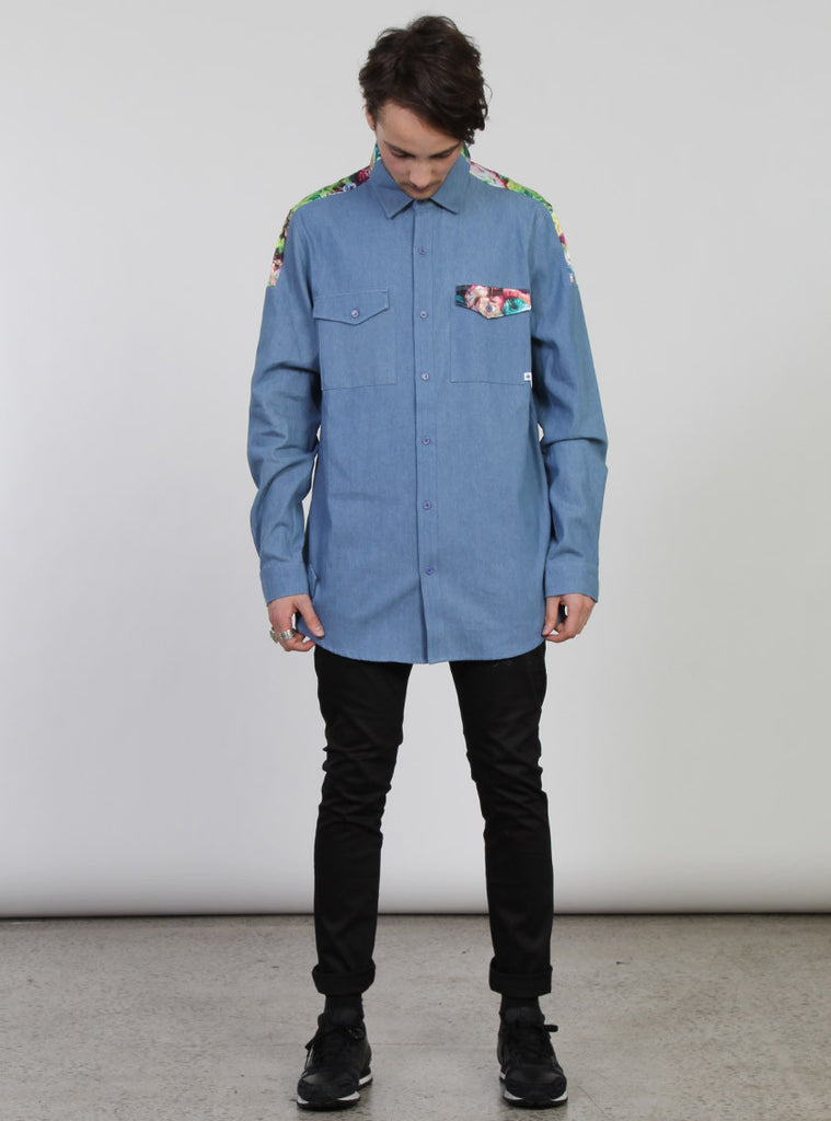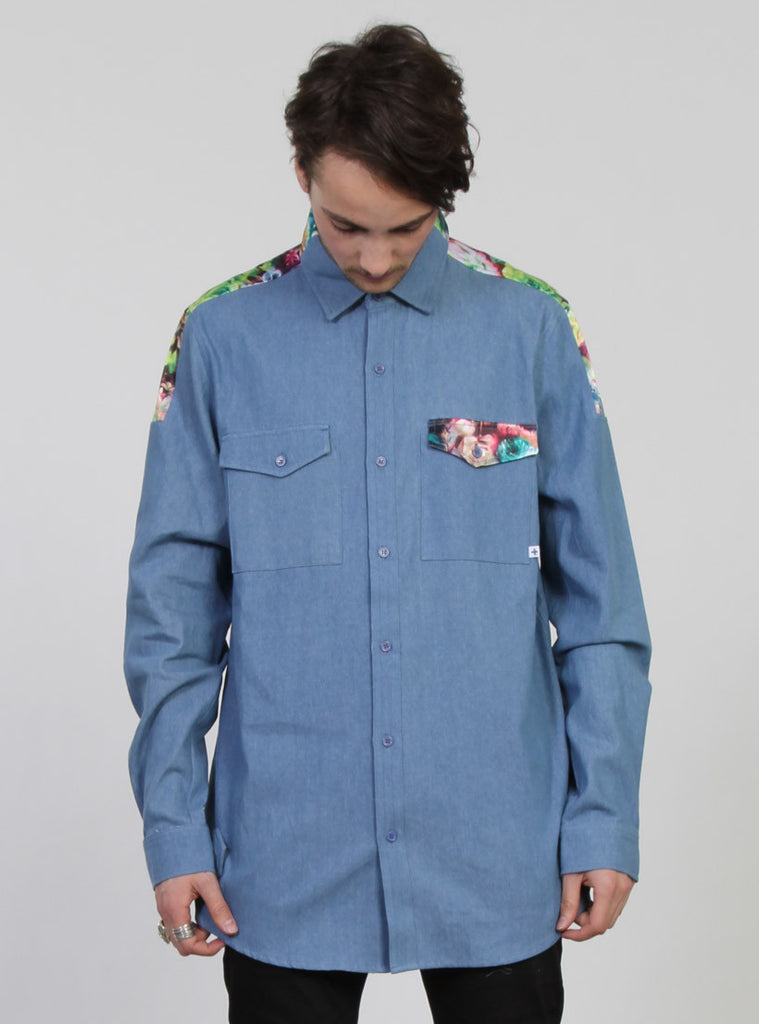 Mens long sleeve collared shirt with button placket and cuff. Contrasting panelled yoke, sleeve top, offset pocket flap and back of collar. Two front button flap chest patch pockets +. Pip in side of left chest pocket.