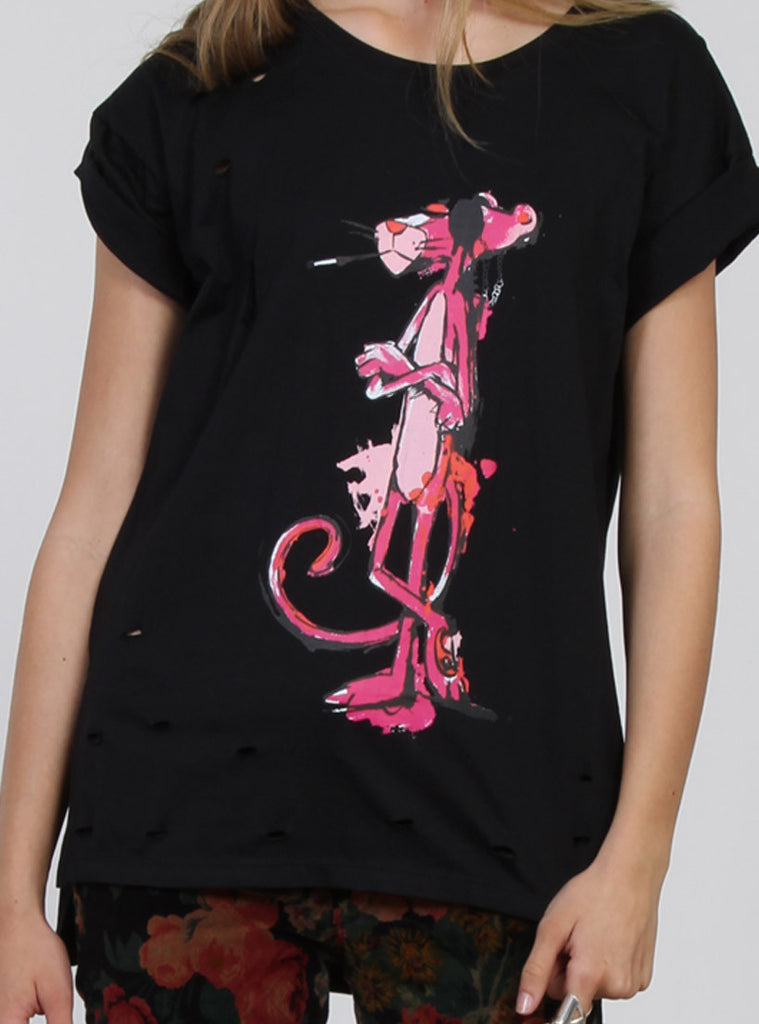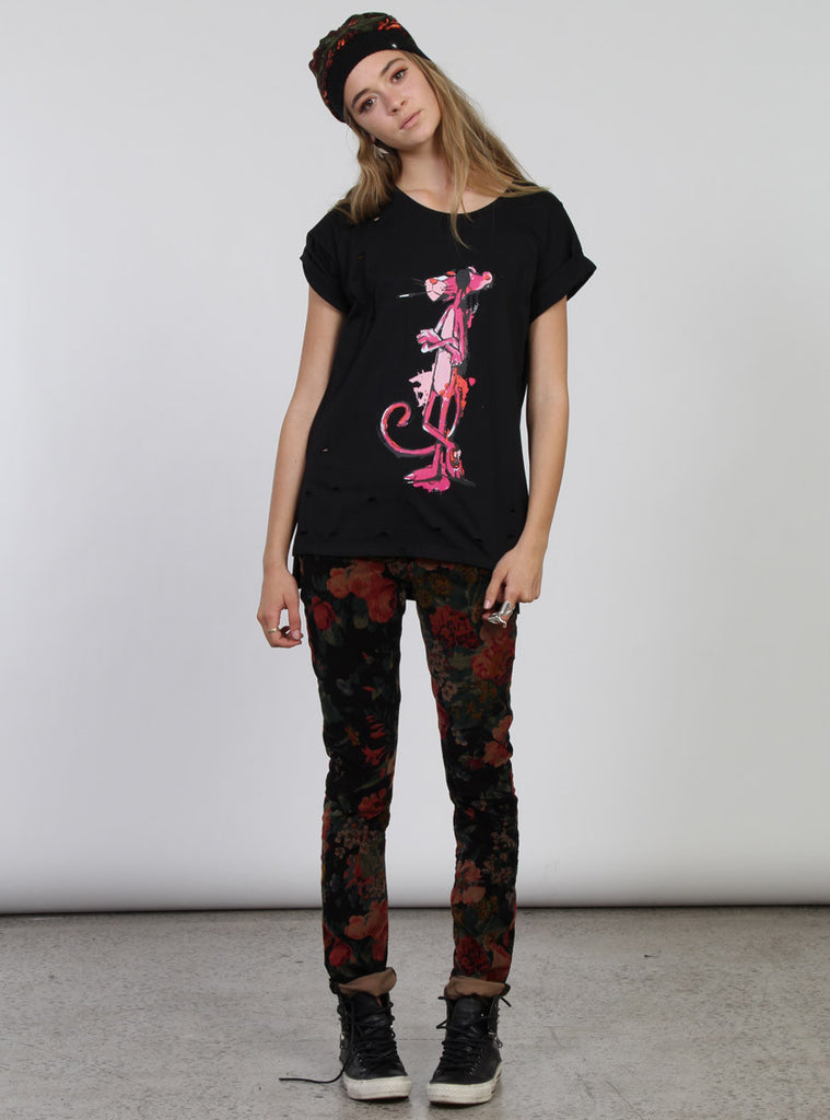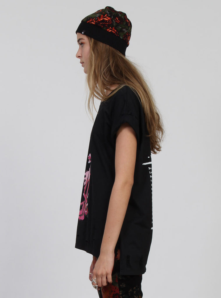 Womens short sleeve relaxed fit tee with cuffed and tacked sleeves. Round neck featuring raw edge binding detailing, two side slits and a stepped subtle drop tail +. In left side seam. Custom federation print on centre front.