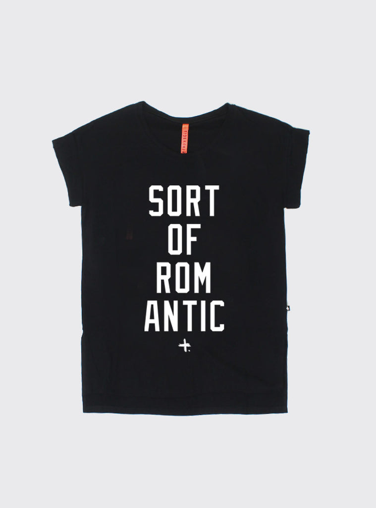 Women's short sleeve relaxed fit tee with cuffed and tacked sleeves. Round neck featuring raw edge binding detailing, two side slits and a stepped subtle drop tail. Printed front and +. pip in left side seam.