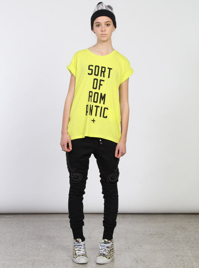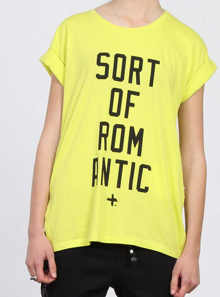 Women's short sleeve relaxed fit tee with cuffed and tacked sleeves. Round neck featuring raw edge binding detailing, two side slits and a stepped subtle drop tail. Printed front and +. pip in left side seam.