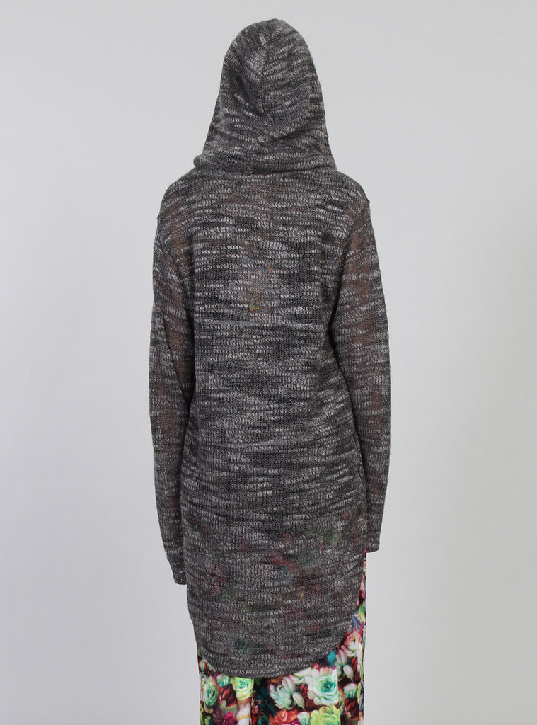 Long length oversized hoodie, in light weight slub knit, slanted hem with exposed metal zip in right side seam. +. Pip in left side seam.