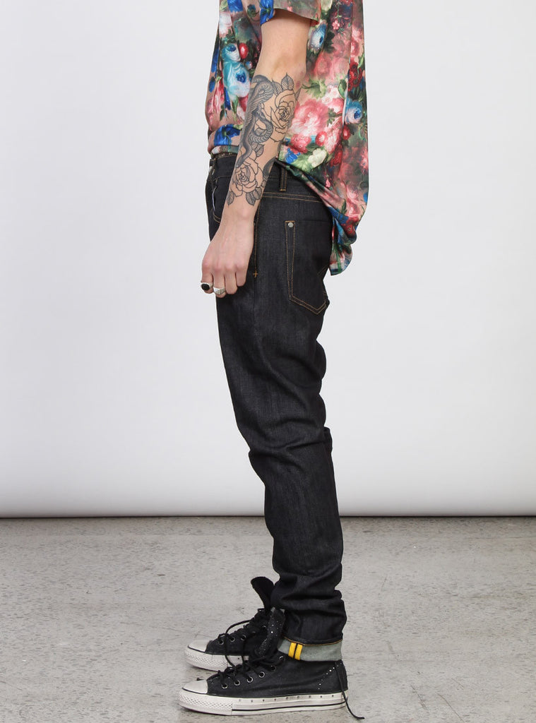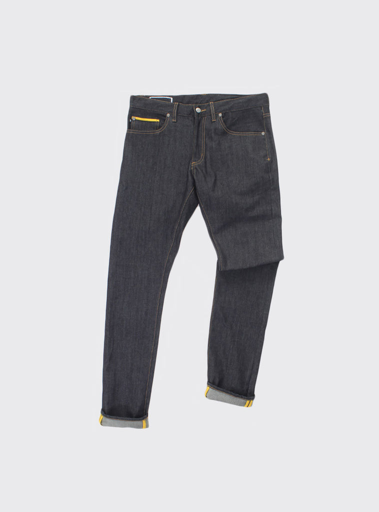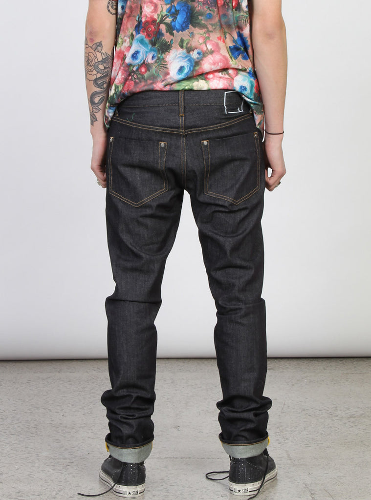 Mens straight cut jean in heavy weight stretch denim. Open pressed side seams featuring contrasting binding. Design detailing topstitching, Federation waistband embroidery, +. tack button, rivet and pip.