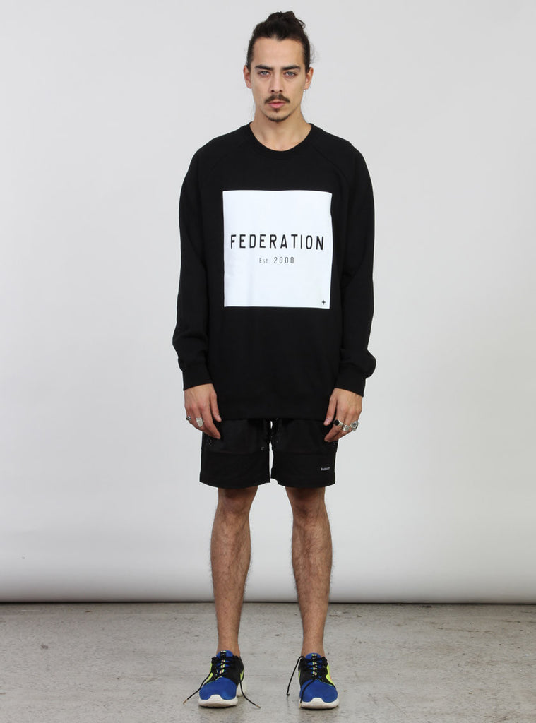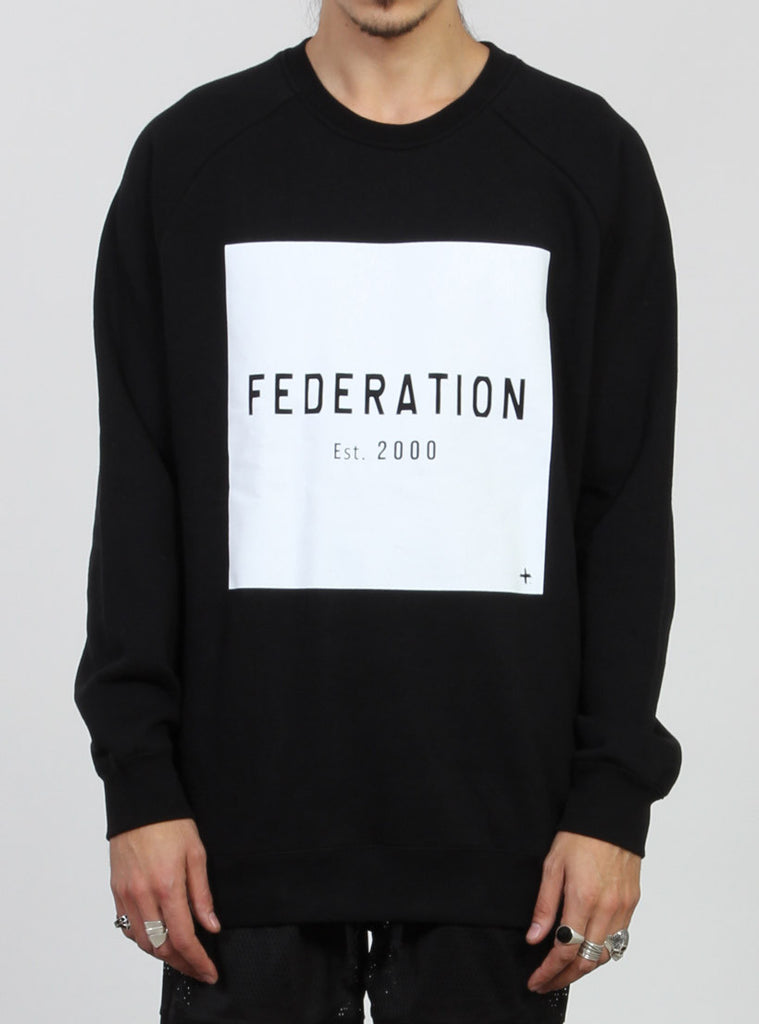 Relaxed fitting crew with drawstring to adjust size with a custom federation print.