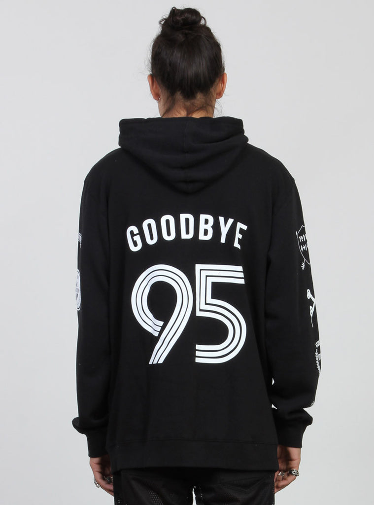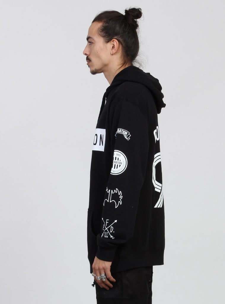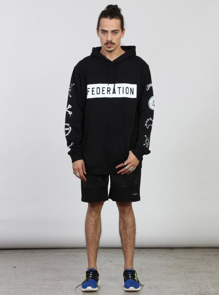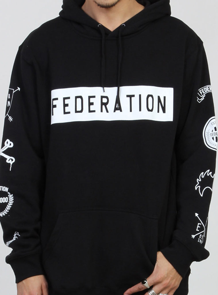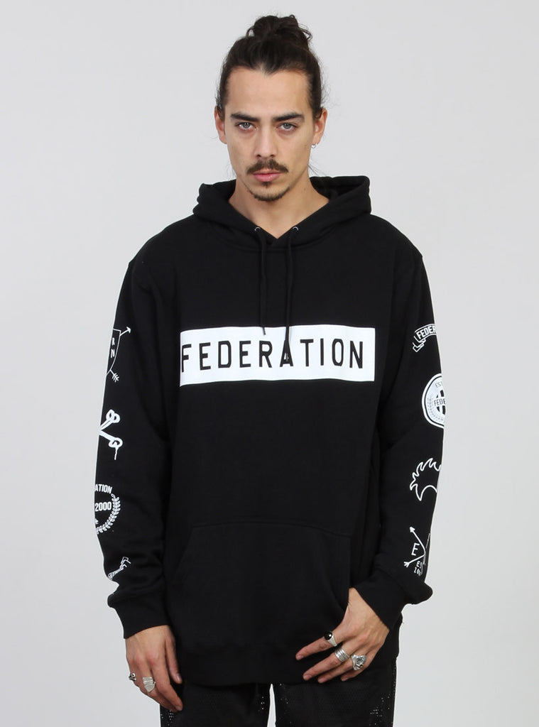 Relaxed fitting pull up hood with drawstring to adjust size. kangaroo pocket with with custom federation print.