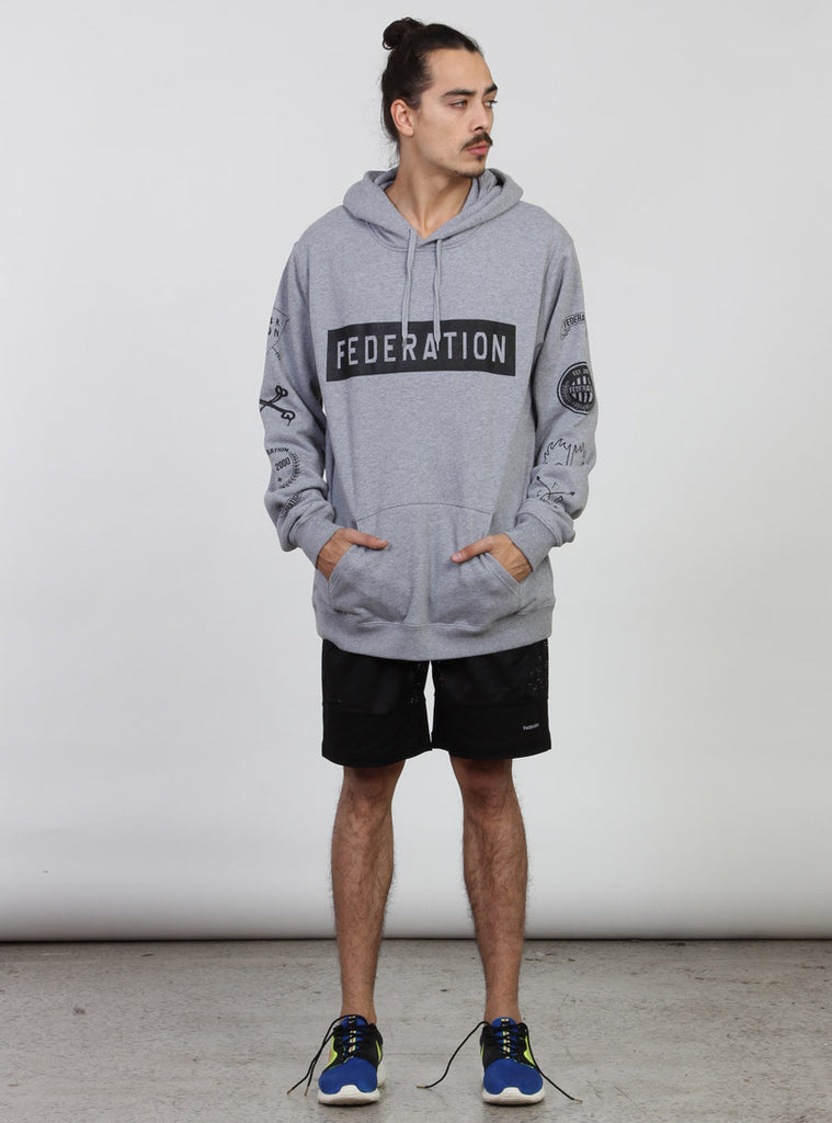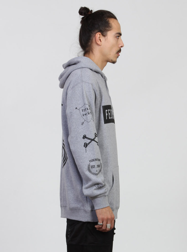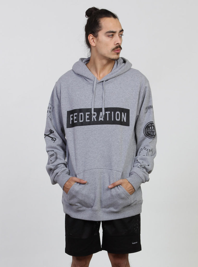 Relaxed fitting pull up hood with drawstring to adjust size. kangaroo pocket with with custom federation print.